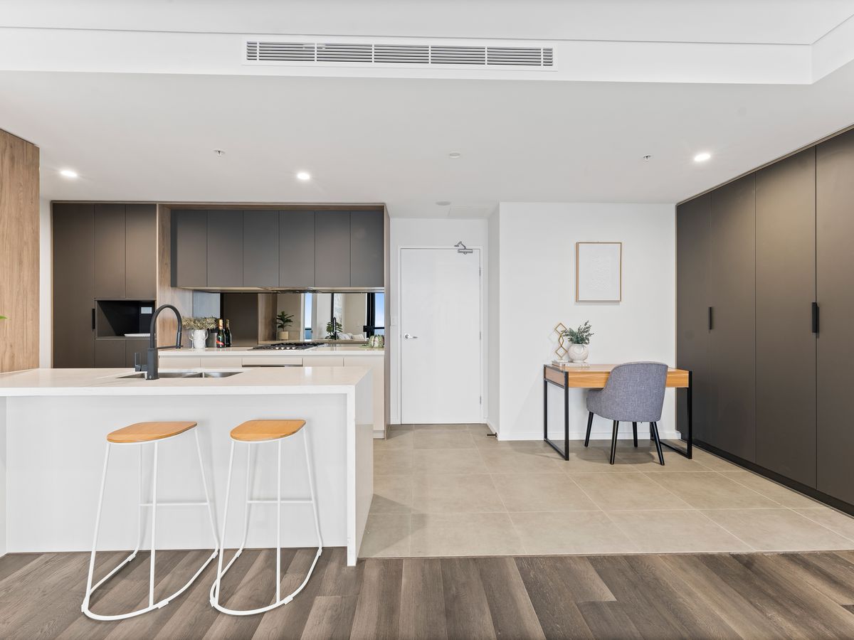 From the moment you enter, you'll be drawn into the open-plan living and dining areas, seamlessly connected to a sleek chef's kitchen featuring gas cooking, premium integrated appliances, 40mm stone benchtops, and a mirrored splashback.